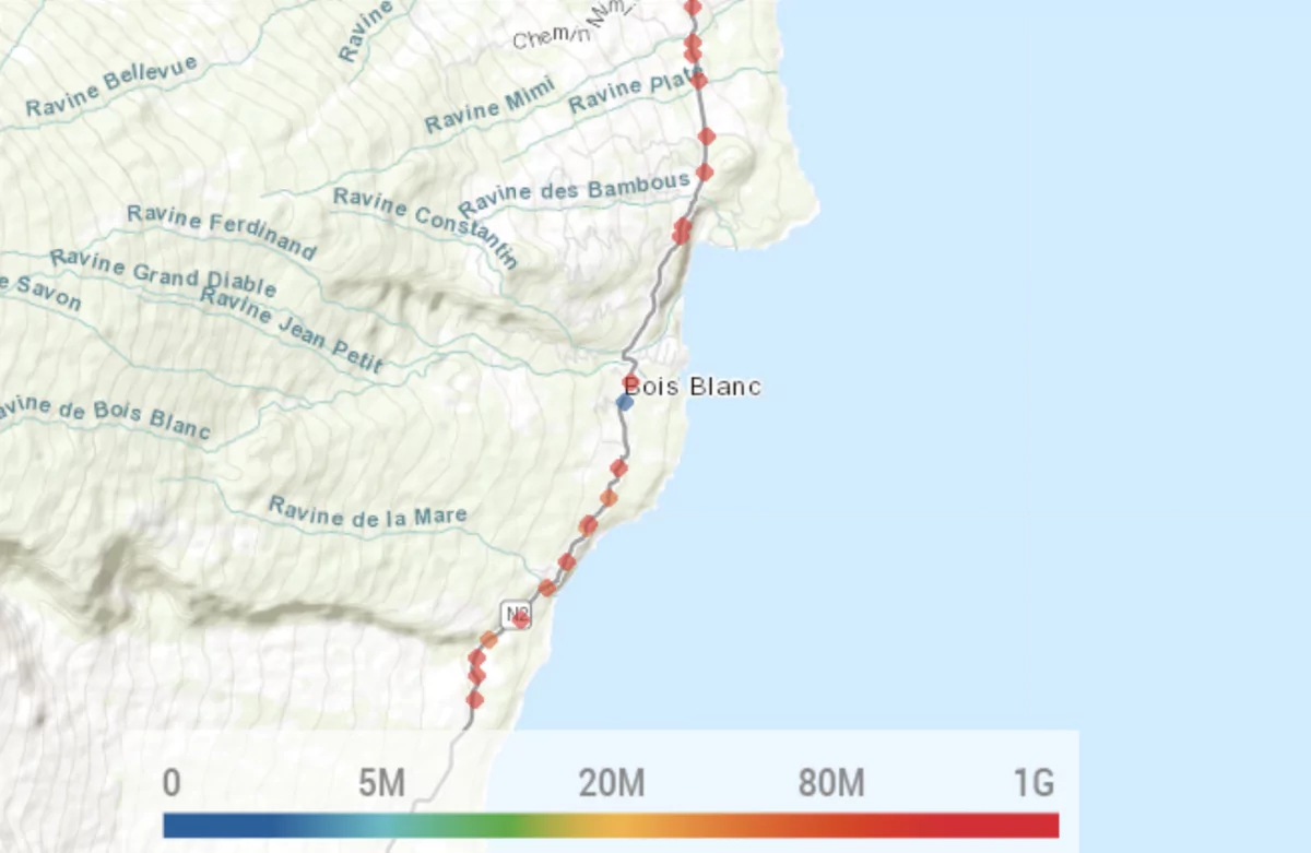 Selon les résultats des tests effectués par les utilisateurs nPerf, les zones bleues et vertes ont un débit faible (débit descendant de 0 Mb/s à 10 Mb/s), pour les zones jaunes et oranges le débit est moyen (débit descendant de 10,1 Mb/s à 29,9 Mb/s) et pour les zones rouges le débit est élevé (débit au-dessus de 30 Mb/s).