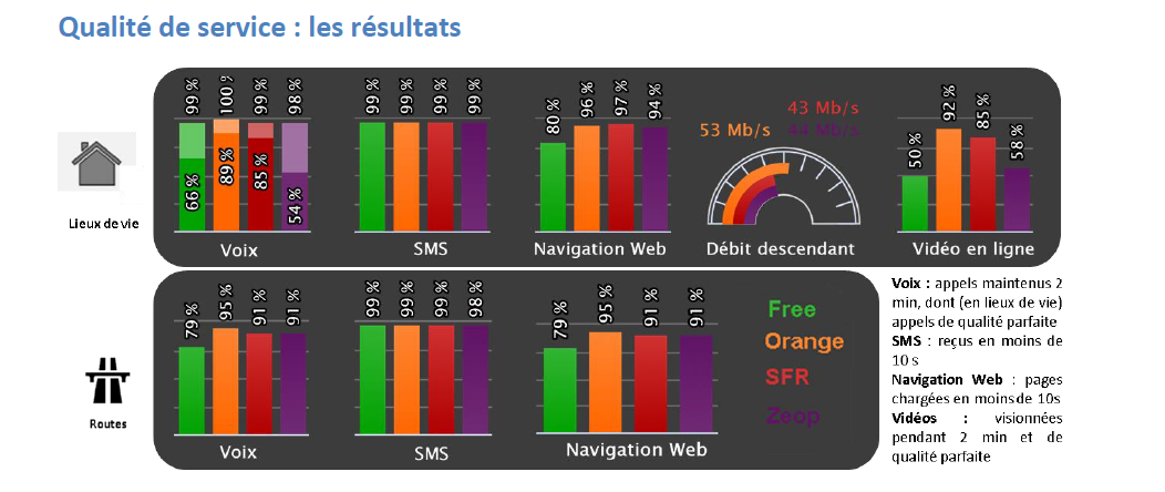 Lorsque nous comparons avec les résultats de la campagne de 2019, nous pouvons observer que Free a progressé sur la navigation web de 23% dans les lieux de vie et de 34% sur les routes, mais également sur les SMS où ce dernier rejoint les opérateurs historiques en étant ex aequo sur les lieux de vie et sur les routes.