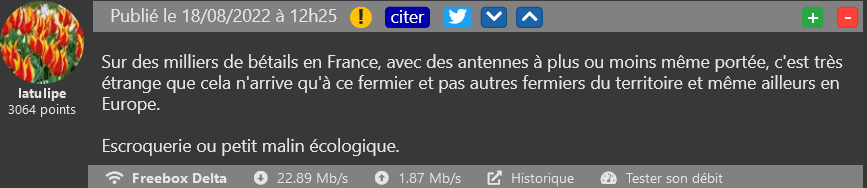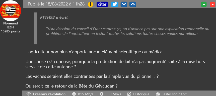 Une antenne qui fait beaucoup parler d’elle. Un agriculteur a estimé qu’une antenne sur laquelle émettent les quatre opérateurs était responsable de la mort de ses vaches. Si le tribunal avait jugé qu’il fallait l’arrêter, le Conseil d’État a finalement annulé cette décision. Excédé, l’agriculteur a alors tenté de saboter l’antenne directement. Du côté des lecteurs, certains sont divisés, estimant que l’Autorité aurait du se pencher plus en avant sur les potentiels effets de l’antenne sur le bétail. D’autres rétorqueront cependant qu’aucune preuve scientifique n’a été apportée par le plaignant, si ce n’est son ressenti et un lien de cause à effet qui n’a pas été réellement démontré.