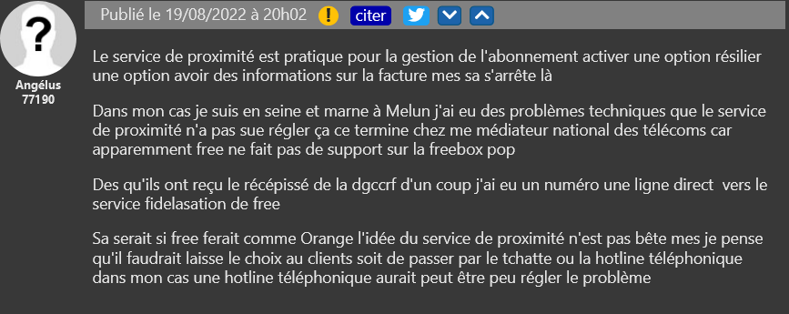 Si vous êtes dans une des villes desservies par Free Proxi, un appel au service-client de l’opérateur vous reconduira désormais vers un assistant près de chez vous. Free Proxi ambitionne, grâce à des conseillers situés proche de chez vous, de répondre le plus vite possible à vos besoins. Cependant, tout n’est pas forcément tout rose et alors que certains témoignages ne tarissent pas d’éloges pour leur expérience avec leur conseiller Proxi, d’autres racontent leurs déboires…