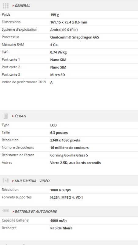 Ce smartphone propose pour rappel un chipset Qualcomm Snapdragon 665 avec 4 Go de RAM, un écran IPS 6,3 pouces dans une définition Full HD+, un quadruple capteur photo 48/8/2/2 Mégapixels et une batterie 4 000 mAh rechargeable en 18 Watts. Nous avions d’ailleurs pu vous proposer un test. Il s’était montré très convaincant.