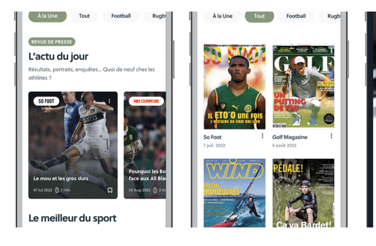 Près de 80 médias sportifs sont ainsi accessibles dont belN Sports, SO FOOT, Figaro Sport, AFP Sport, Midi Olympique, Onze Mondial, Pédale!, Basket USA ou encore Tennis Magazine. Pour y accéder, il suffit de se rendre sur la page d’accueil de l’application et site internet ou de se rendre dans l’espace de recherche et sélectionnez la catégorie Sport. I