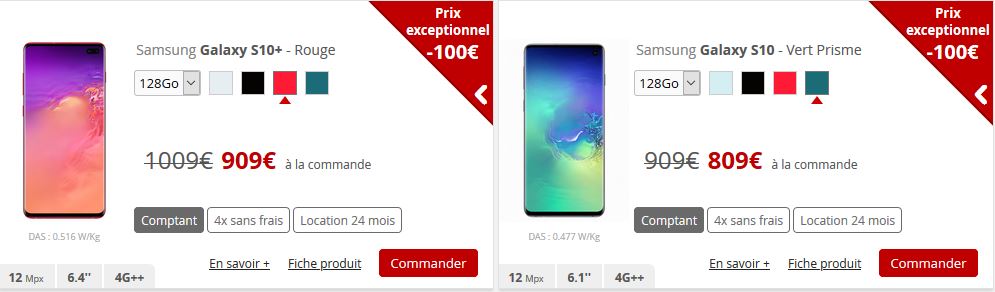 - Le Samsung Galaxy S10+ est ainsi proposé avec une réduction de 100€, soit pour 909€ au lieu de 1009€ dans sa version 128 Go de stockage.Vous pouvez également le commander en 4x sans frais pour 228€ à la commande puis trois fois 227€. En location, il faudra compter 189€ à la commande puis 25€ par mois pendant 24 mois .Pour la version 512 Go, vous pouvez vous le procurer pour 1159€ au lieu de 1259€. Il est également disponible en 4 fois sans frais, pour 292€ à la commande puis 3 fois 289€. Vous pouvez retrouver notre test complet de ce modèle sur cet article.