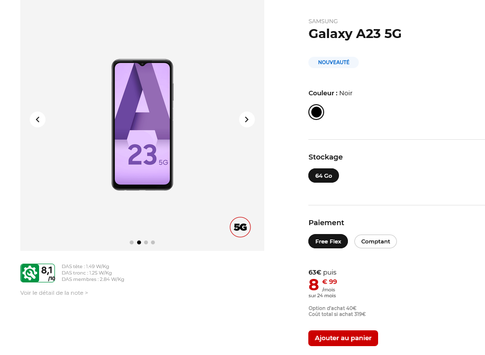 Il est ainsi disponible pour 319€ dans son coloris noir si vous souhaitez régler au comptant. Avec la solution Free Flex, il faudra débourser 63€ lors de la commande, puis 8.99€/mois sur 24 mois, avec 40€ supplémentaires pour un achat définitif.