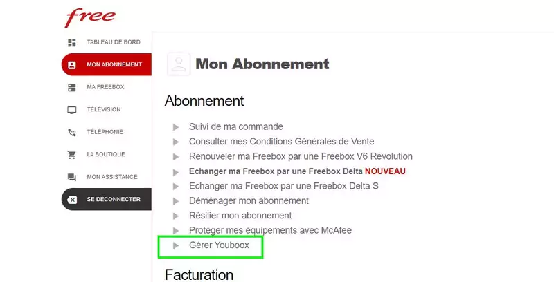 Se connecter à l’espace abonné accessible à l’adresse https://subscribe.free.fr/login/. De là, cliquer sur “Mon abonnement”, puis sur “Gérer Youboox”.