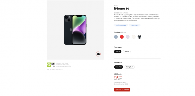 Dans le détail, l’iPhone 14 est affiché à 1019 € dans sa version 128 Go. Avec Free Flex, 439€seront à verser à la commande puis 19€99/mois sur 24 mois. Loption d’achat s’élèvera ensuite à 100€. Le modèle 256 Go passe à 1149€. Plusieurs coloris sont disponibles comme bleu, Red, mauve, lumière stellaire et minuit. Quid de ses capacités, il embarque comme sa version Plus la puce A15 dédiée aux iPhones 13 Pro et des capteurs photos repensés pour optimiser la capture d’image, tant sur le capteur principal que pour les selfies. Du côté de la vidéo, un stabilisateur est intégré grâce au mode action. Côté design, assez peu de changement avec toujours une encoche. Les premières livraisons sont attendues le 16 septembre.