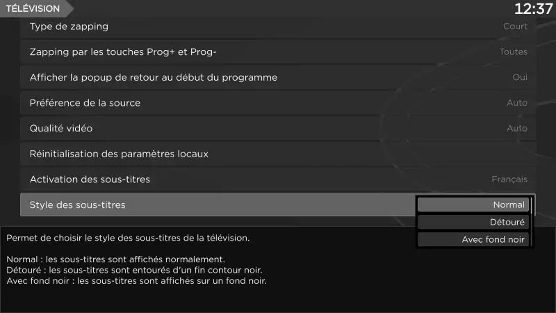 En cliquant sur la rubrique “Style des sous-titres”, vous aurez alors le choix entre “Normal” (sans rien), “Détouré” (fin contour noir) ou “Avec fond noir” (texte sur fond noir).