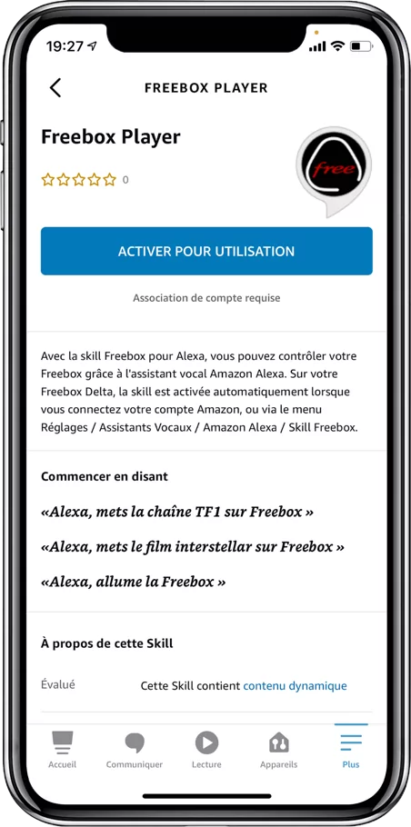 Il est également possible de profiter de cette fonctionnalité même sans enceinte Amazon, en utilisant le micro de votre smartphone via l’application Alexa. Il faudra alors associer votre Player à l’assistant vocal et de vous trouver sur le même réseau WiFi pour les deux appareils. Vous pourrez ainsi profiter des différentes commandes vocales possibles pour contrôler votre Freebox TV. A noter, pour une utilisation sur smartphone, il faudra bien préciser que l’action doit être effectuée sur la Freebox. Free fournit quelques exemples types :