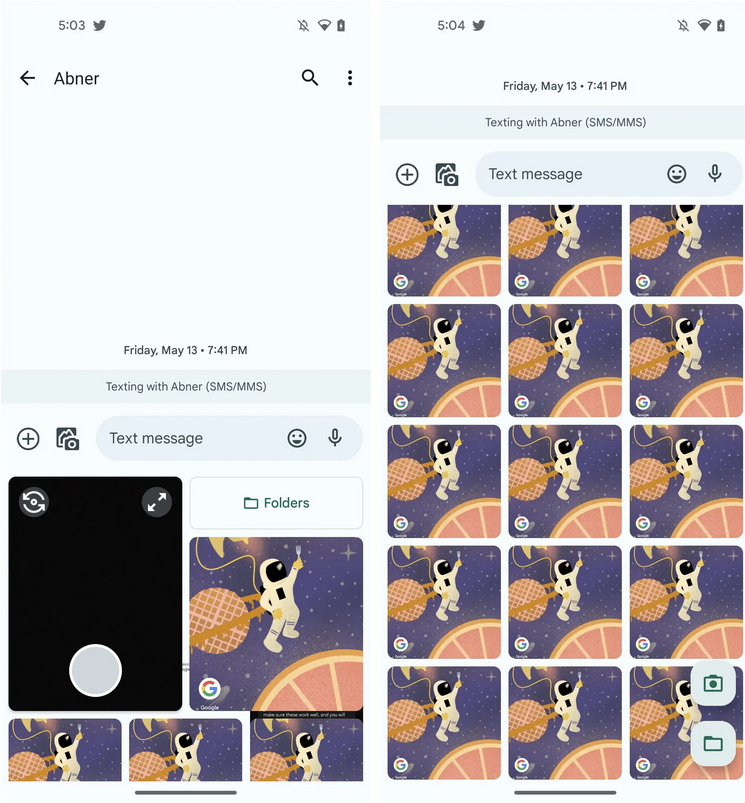 Dans la volée de nouvelles fonctionnalités, l’envoi d’images va également être simplifié avec une refonte totale de la galerie de photos. Actuellement, l’application propose une grille à défilement horizontal de vos images récentes mais aussi la possibilité de prendre une photo à la volée. Dans cette nouvelle version, une grille comprenant davantage d’images s’affichera directement et la photo ou les dossiers seront accessibles via un petit bouton en bas à droite de la grille.