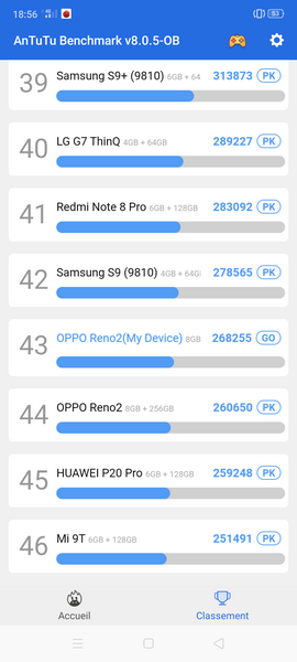 Dans le benchmark AnTuTu, le Oppo Reno2 se retrouve entre des Samsung Galaxy S9 et Huawei P20 Pro, deux anciens haut de gamme de 2018. On ne peut plus clair concernant les performances à en attendre.