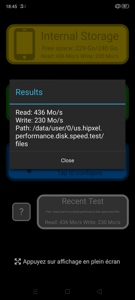 La mémoire de stockage n’est pas non plus la plus rapide, mais elle assure d’assez bons débits en écriture et lecture pour profiter de temps d’installation et de chargement assez corrects. L’outil Disk Speed nous indiquait 230 Mo/s en écriture et 436 Mo/s en lecture.
