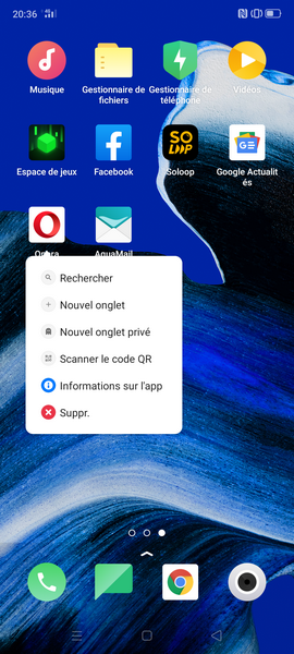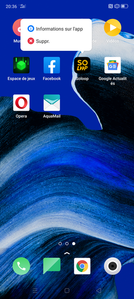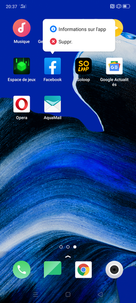Quelques logiciels sont pré-installés dans le cadre de partenariats commerciaux, dont Facebook, Opera et Soloop. On peut les supprimer aisément, après un appui prolongé sur l’icône.