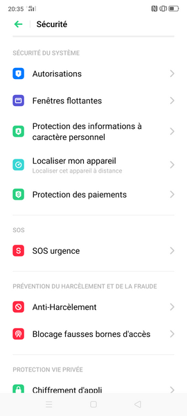 La section sécurité (anti-harcèlement, blocage des fausses bornes d’accès, chiffrement d’applications, etc.)