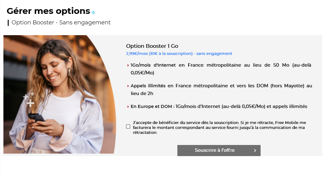 Cliquez cette ligne et vous atterrissez ensuite sur une page dédiée à l’option, qui vous permet de connaître pleinement les conditions d’activation de l’offre, y compris les 10€ supplémentaires lors de la souscription.