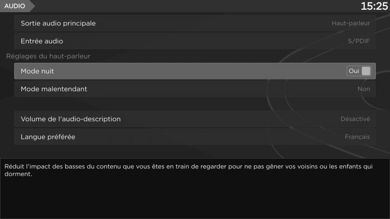 Repérez ensuite la fonction “Mode nuit”. Il vous suffira de basculer sur “Oui” pour réduire les nuisances sonores. Ce réglage permet de réduire fortement le niveau des basses.