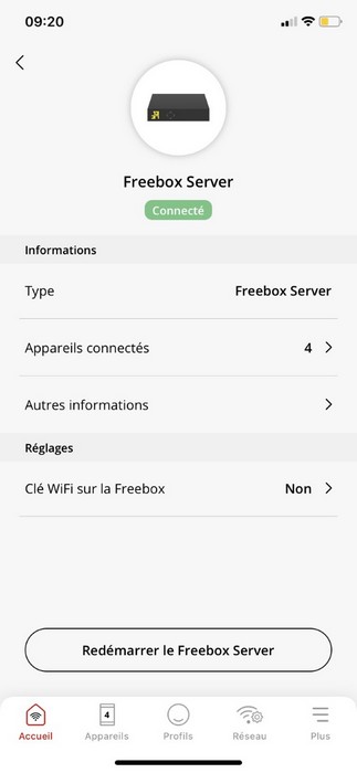 Mais alors comment faire ? Il suffit de télécharger l’application Freebox Connect disponible sur Android et iOS. Depuis la page d’accueil, il suffit de tapoter “Freebox Server” dans mes équipements. Tout en bas, un bouton vous permettra de redémarrer votre serveur Freebox.