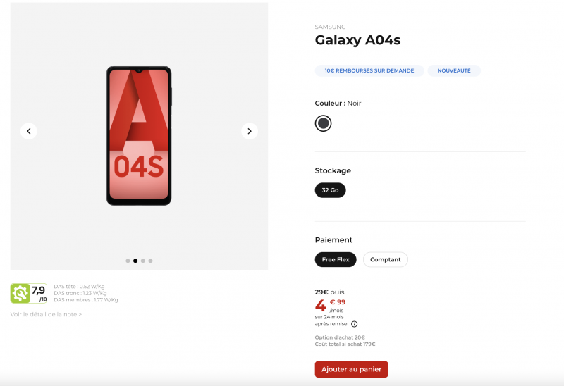 Proposé dans sa version 32 Go, le Samsung Galaxy A04s est affiché à 179€ en achat comptant. Avec Free Flex, il faudra débourser 39€ à la commande puis 24 mensualités de 4,99€. L’option d’achat pour l’acquérir définitivement ensuite est fixée à 20€. A noter qu’une offre de remboursement de 10€ est disponible pour ce modèle à condition d’opter pour la solution de paiement par étalement de Free. Pour en profiter, l’abonné devra se connecter à mobile.free.fr/account/monODR avant de saisir le numéro IMEI du smartphone présent sur l’étiquette du coffret ou sur votre facture.