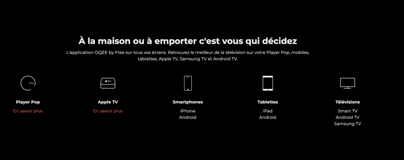 Disponible en mobilité pour tous les abonnés Freebox (iOS et Android) mais aussi sur Apple TV, Smart TV Samsung, Android TV et Chromebook, l’application Oqee va poursuivre son déploiement sur de nouveaux supports.