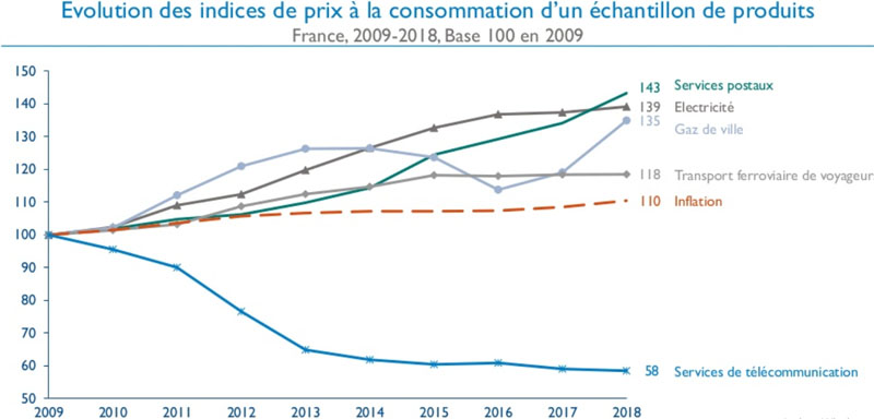 Un des faits les plus marquants concerne les prix des services télécoms, qui incluent les box et le mobile. En effet, on constate une forte baisse, en particulier autour de 2012, lors de l’arrivée de Free Mobile. Depuis 2013-2014, la baisse est continue, mais nettement moins importante. Depuis 2009 la baisse de prix des services télécom aura ainsi été de 42%. Et ce chiffre est encore plus marquant quand on le met en relation avec d’autres services, qui ont, eux, augmenté sur la période. Le cabinet de conseil Arthur D. Little note ainsi que ” depuis 10 ans, les prix des services télécoms ne cessent de baisser contrairement à d’autres secteurs régulés, essentiels pour les français”