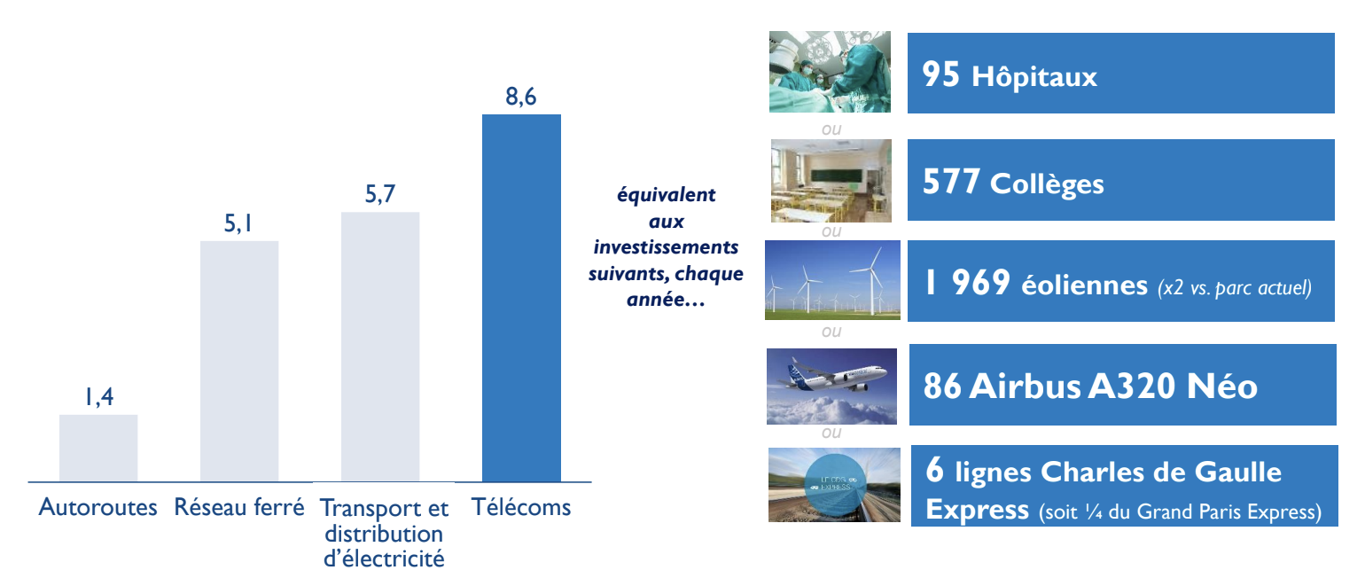 “Le secteur des télécoms porte les plus forts investissements dans les infrastructures en France ce qui lui confère un poids économique considérable”, précise l’étude, soit un investissement moyen de 8,6 milliards d’euros par an depuis 2014. En équivalence, cela représente 6 lignes Charles de Gaulle Express ; 1/4 du Grand Paris Express ; 86 Airbus A 320 Néo (prix catalogue) ; 95 hôpitaux ; 577 collèges.