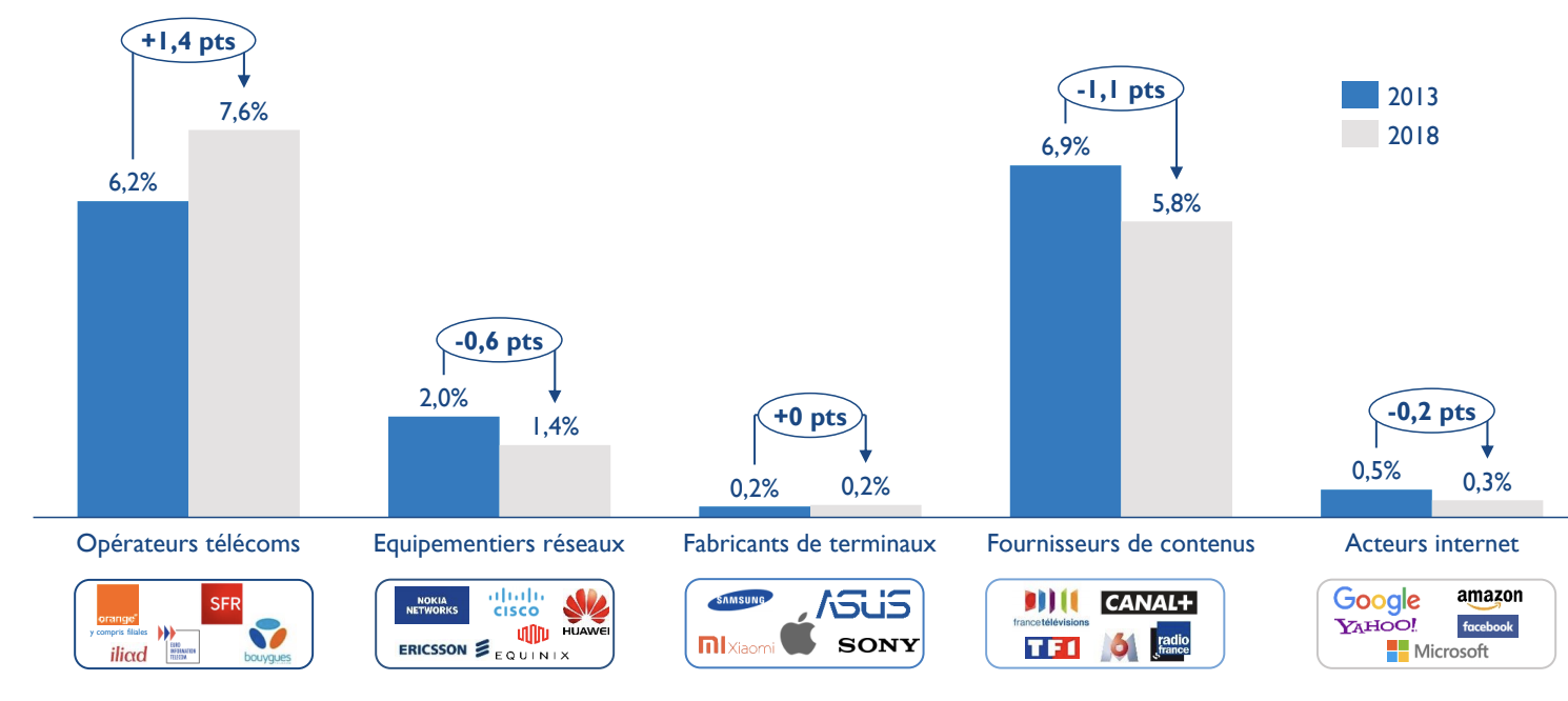 Niveau d’imposition en % des revenus pour les principaux acteurs de l’écosystème numérique en France, 2013 vs 2018