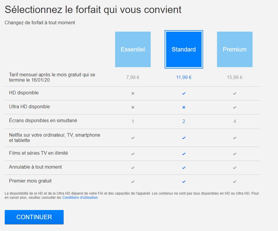 Une fois cela fait, vous entrez directement dans le bain avec une proposition des trois forfaits proposés par Netflix : Essentiel, Standard et Premium, à vous de choisir.