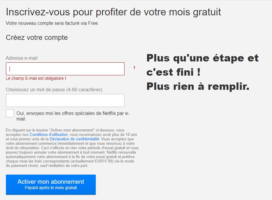 Vous devez ensuite saisir votre mot de passe pour finaliser la création d’un compte. Une fois cela fait, vous serez directement redirigé vers une page confirmant votre abonnement Netflix. La facturation par Free est automatique, il vous suffit de choisir votre offre en cliquant sur changer de forfait (l’offre proposée par défaut est le forfait Premium), puis de valider l’option.