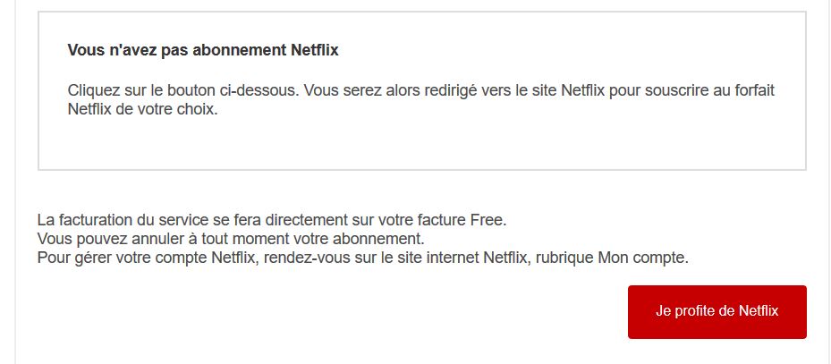 Une page dédiée Netflix y est apparue, cliquez dessus. Deux cas de figure sont présentés : si vous avez déjà un compte Netflix, il suffit donc de vous y connecter sur l’application dorénavant présente sur la Freebox Révolution. Si vous n’avez pas de compte Netflix et que vous souhaitez l’associer à votre facture Free, vous pouvez choisir la deuxième option et cliquer sur “Je profite de Netflix”.