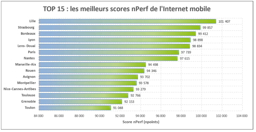 Strasbourg pour sa part a été détrôné l’année dernière chutant à la neuvième place en 2021 mais a clairement repris des couleurs en récupérant sa deuxième place. Bordeaux prend la troisième place du podium à Lyon. nPerf souligne par ailleurs une situation assez insolite à Avignon, qui propose le deuxième meilleur débit descendant mais figure malgré tout 10e au score.
