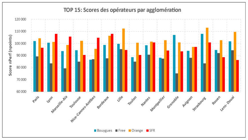 Cette année encore, ce sont les abonnés Orange qui ont bénéficié des meilleures performances de réseau mobile dans les deux tiers des agglomérations du top 15 sur la base du score global attribué par nPerf. SFR pour sa part propose de meilleures expériences à Lyon, Aix-Marseille, Bordeaux et Nice-Cannes-Antibes tandis que Bouygues Telecom est leader à Grenobe mais perd sa position à Grenoble.