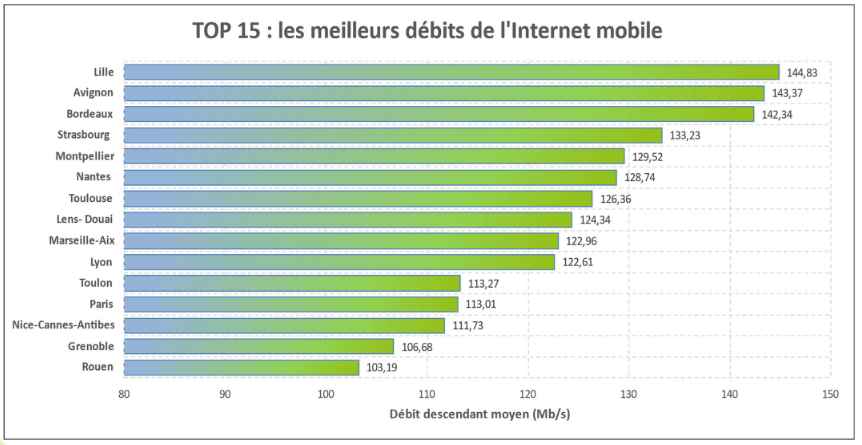 “Comme l’année dernière, hormis Lyon, les plus grosses agglomérations de France (Paris et Marseille) sont toujours loin des meilleures performances de l’Internet mobile, puisque toujours en 6ème et 8ème place du classement, respectivement. Fait intéressant, lors de notre dernier rapport sur ce TOP15, aucune agglomération avait enregistré un débit descendant moyen supérieur (ou égal) à 100 Mb/s. Aujourd’hui, pas une seule ne figure en-dessous” explique nPerf. Les scores ont en effet progressé de 17% en un an, une amélioration attribuée à la généralisation progressive de la 5G.