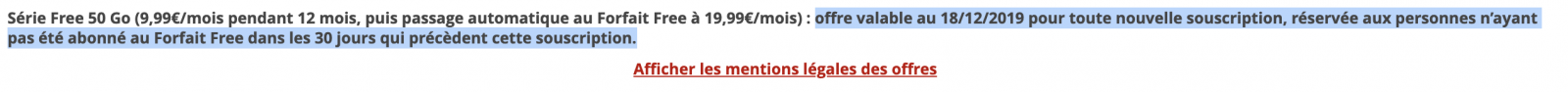 Ça bouge chez Free Mobile et plus particulièrement pour son forfait “Série Free 50 Go”. Depuis son lancement en juillet 2018, l’opérateur applique une date de validité sur son offre en la prolongeant semaine après semaine. Cela lui a notamment permis de faire du yoyo à de multiples reprises sur une courte du durée en augmentant de 10 Go puis en baissant la data incluse dans son forfait. Mais aujourd’hui l’opérateur a visiblement décidé de figer son offre à 50 Go en modifiant ses mentions légales. Fini l’information du type “offre valable du XX au XX” et place désormais à “valable au XX”.