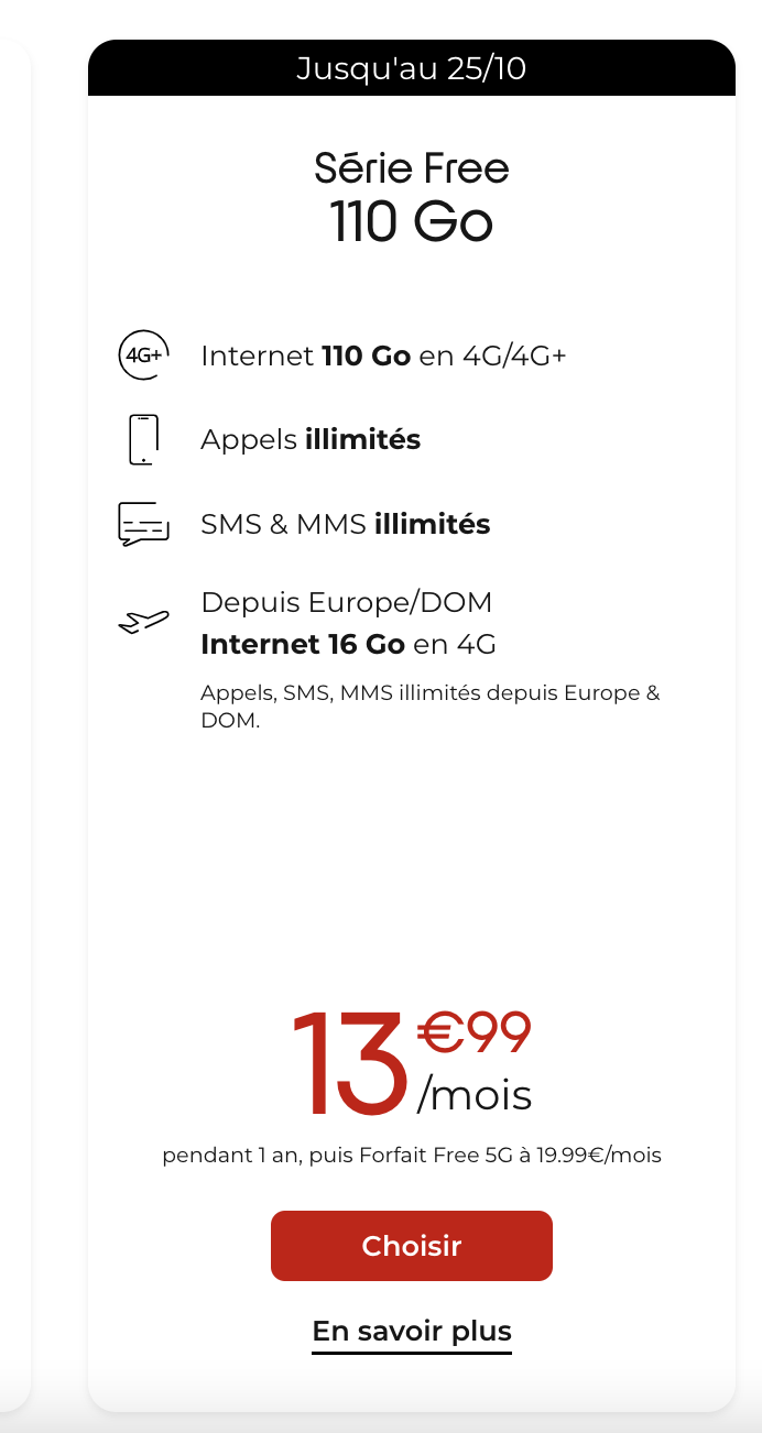 Après avoir baissé de 2€ il y a une semaine le prix de son forfait Série Free, l’opérateur décide aujourd’hui d’augmenter son tarif d’un euro jusqu’au 25 octobre. Pour 13,99€/mois pendant 1 an, l’offre comprend 110 Go en France métropolitaine, mais aussi 16 Go depuis Europe/DOM en 4G ainsi qu’un accès à Free Ligue 1. Les abonnés basculeront ensuite automatiquement vers le forfait 5G 210 Go à 19,99€/mois.