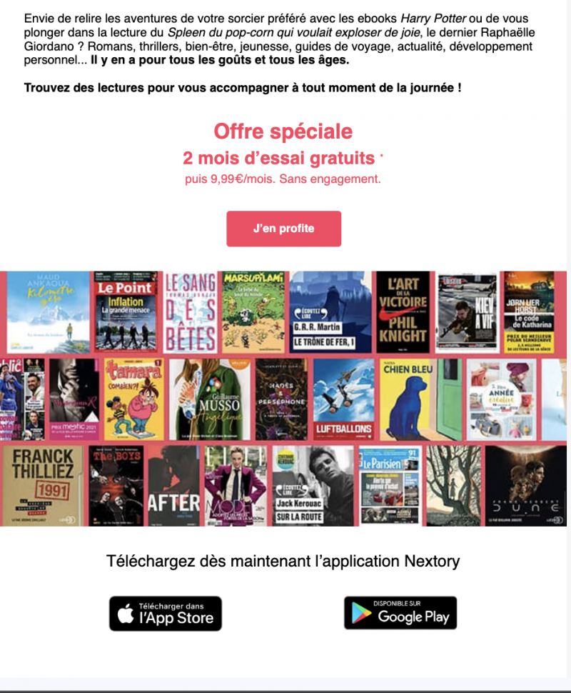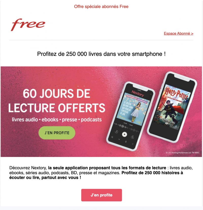 “Découvrez Nextory, la seule application proposant tous les formats de lecture : livres audio, ebooks, séries audio, podcasts, BD, presse et magazines. Profitez de 250 000 histoires à écouter ou lire, partout avec vous”, annonce actuellement Free dans un courriel envoyé progressivement à ses abonnés. Habituellement affiché à 9,99€/mois, l’abonnement à ce service de lecture en ligne est proposé actuellement avec 60 jours offerts, “un cadeau d’automne” à portée de clic. Il suffit de se rendre sur la page dédiée et de se créer un compte.