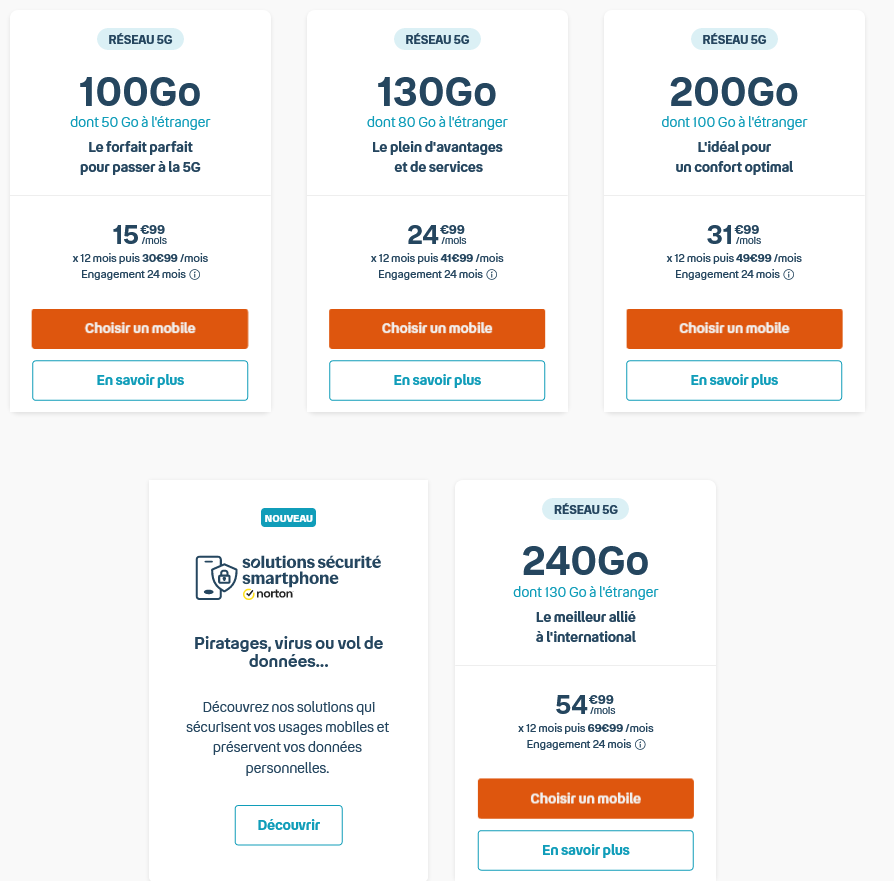 - Forfait 5 Go en France, Europe, DOM et Andorre : 11,99 €/mois pendant 1 an, puis 20,99 €/mois. (existe aussi en version bloquée)