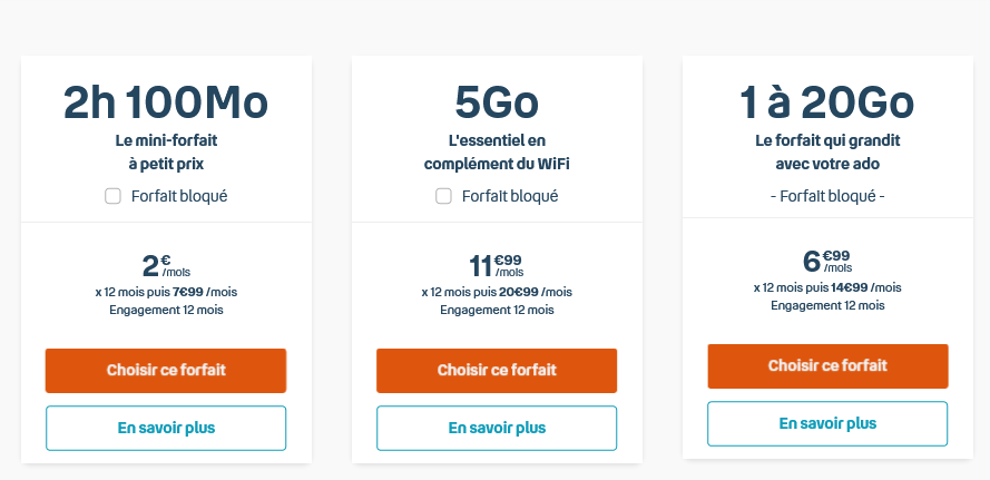- Forfait 2 h, 100 Mo en France, Europe, DOM et Andorre : 2,99 €/mois pendant 1 an, puis 7,99 €/mois. (existe aussi en version bloquée)