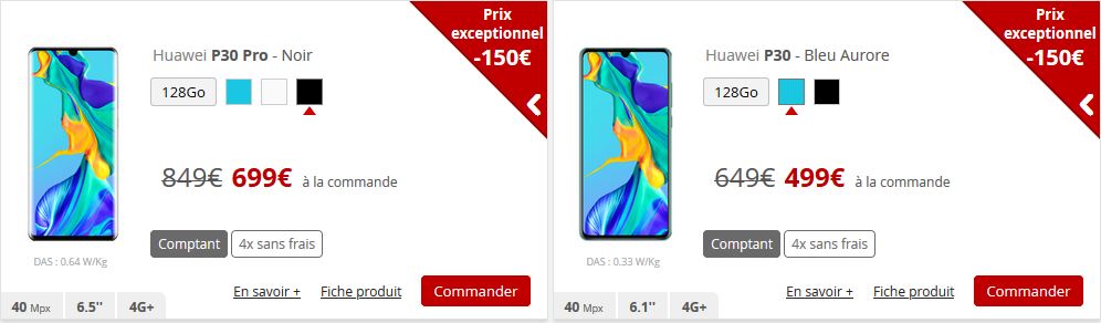 - Le Huawei P30 bénéficie lui aussi d’une réduction de 150€. Pour un achat au comptant, il est proposé à 499€ au lieu de 649€. Si vous souhaitez l’acheter en 4x sans frais, la première commande sera de 127€ puis trois fois 124€ sans frais.
