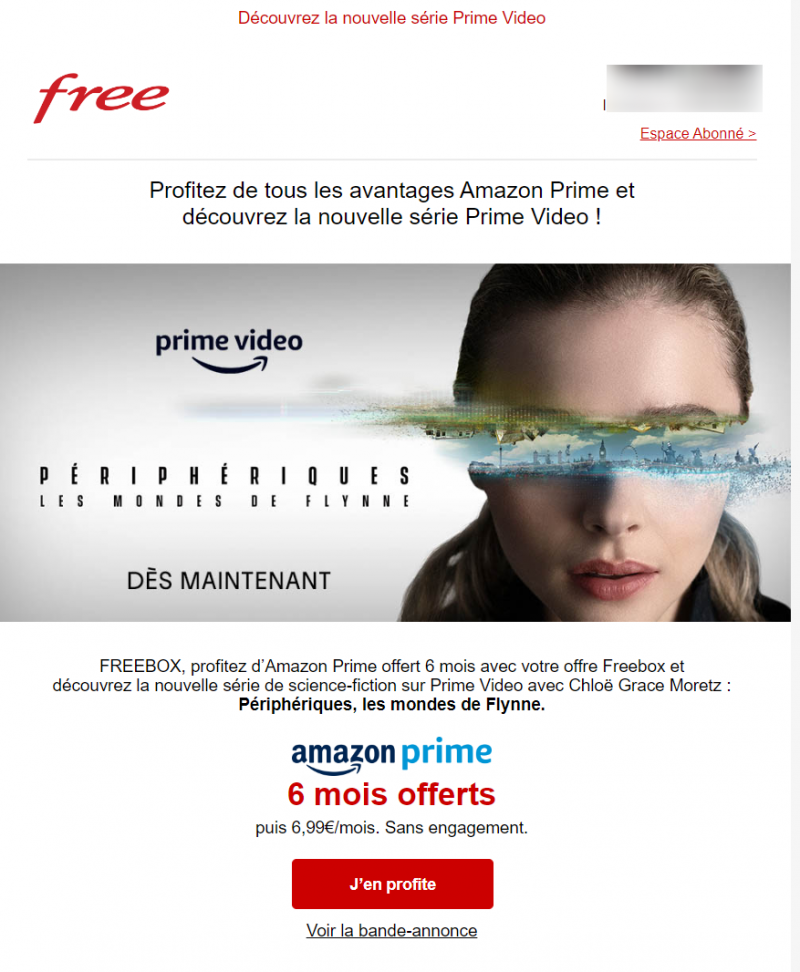 En mai dernier, Free lançait une offre spéciale en direction de ses abonnés Freebox Pop en leur offrant Amazon Prime et donc tous les services associés. L’opérateur renouvelle cette opération et envoie actuellement un mail à ses clients Pop pour leur annoncer qu’ils bénéficient de 6 mois de gratuité à l’offre Amazon Prime.. De quoi profiter de tous les avantages inclus dans l’abonnement comme l’accès à Prime Video et Music Prime, ou encore la livraison en 1 jour ouvré sur des millions d’articles éligibles sur le site d’Amazon.