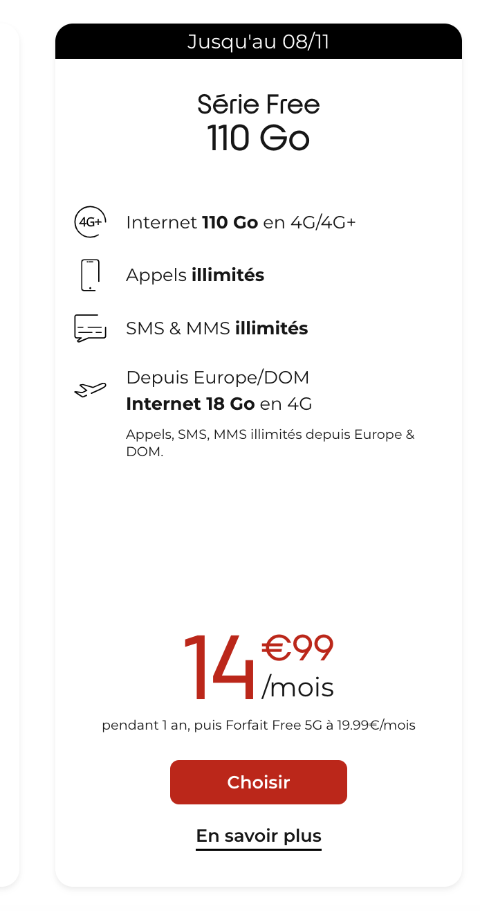 A l’heure où les opérateurs tendent à augmenter leurs tarifs, Free Mobile garantit des prix inchangés pendant encore 5 ans sur ses offres historiques uniquement. Le prix du forfait de son forfait intermédiaire change quant à lui plusieurs fois par mois, entre baisse et augmentation. Pas évident de flairer le bon plan. Ce 26 octobre, l’opérateur décide de proposer son offre 110 Go (18 Go en roaming) à 14,99€/mois pendant 1 an contre 12,99€ et 13,99€ précédemment. C’est la seconde fois en l’espace d’un mois que Free Mobile propose un tarif aussi élevé. Les abonnés basculeront ensuite automatiquement vers le forfait 5G 210 Go à 19,99€/mois.