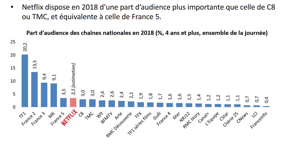 La star de la SVOD a même eu le droit à une estimation toute particulière. En effet, le CNC a souhaité comparer la part d’audience estimée de Netflix à celles des chaînes de télévision linéaires en 2018. Un exercice de pensée amusant, qui révèle cependant une chose surprenante : Netflix possède une part d’audience équivalente à la cinquième chaîne de télévision Française. L’observatoire du CNC estime en effet que Netflix représente 3.5% de l’audience des 4 ans et plus, la plaçant au coude-à-coude avec France 5 et devant C8 ou TMC.