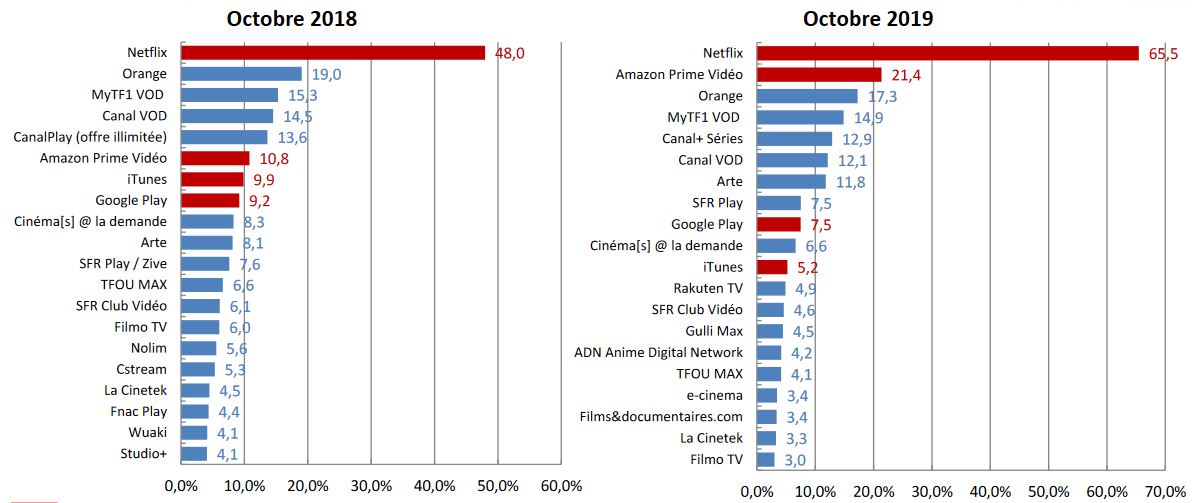 Difficile de parler de VOD sans parler de Netflix. Si la progression du mastodonte de la SVOD est toujours fulgurante, elle atteint de nouveau sommets en représentant 65.5% des consommateurs de vidéo à la demande en octobre 2019 d’après le CNC. Du côté des autres services, on note la progression très forte d’Amazon Prime Video, qui passe de la 6ème à la deuxième place, détrônant Orange. Canal+ Séries, lancé cette année, bénéficie toujours cependant des efforts de CanalPlay, qu’il a remplacé. On note également que plusieurs plateformes françaises ont réussi à détrôner Google Play et iTunes, comme c’est le cas avec SFR Play ou Arte.