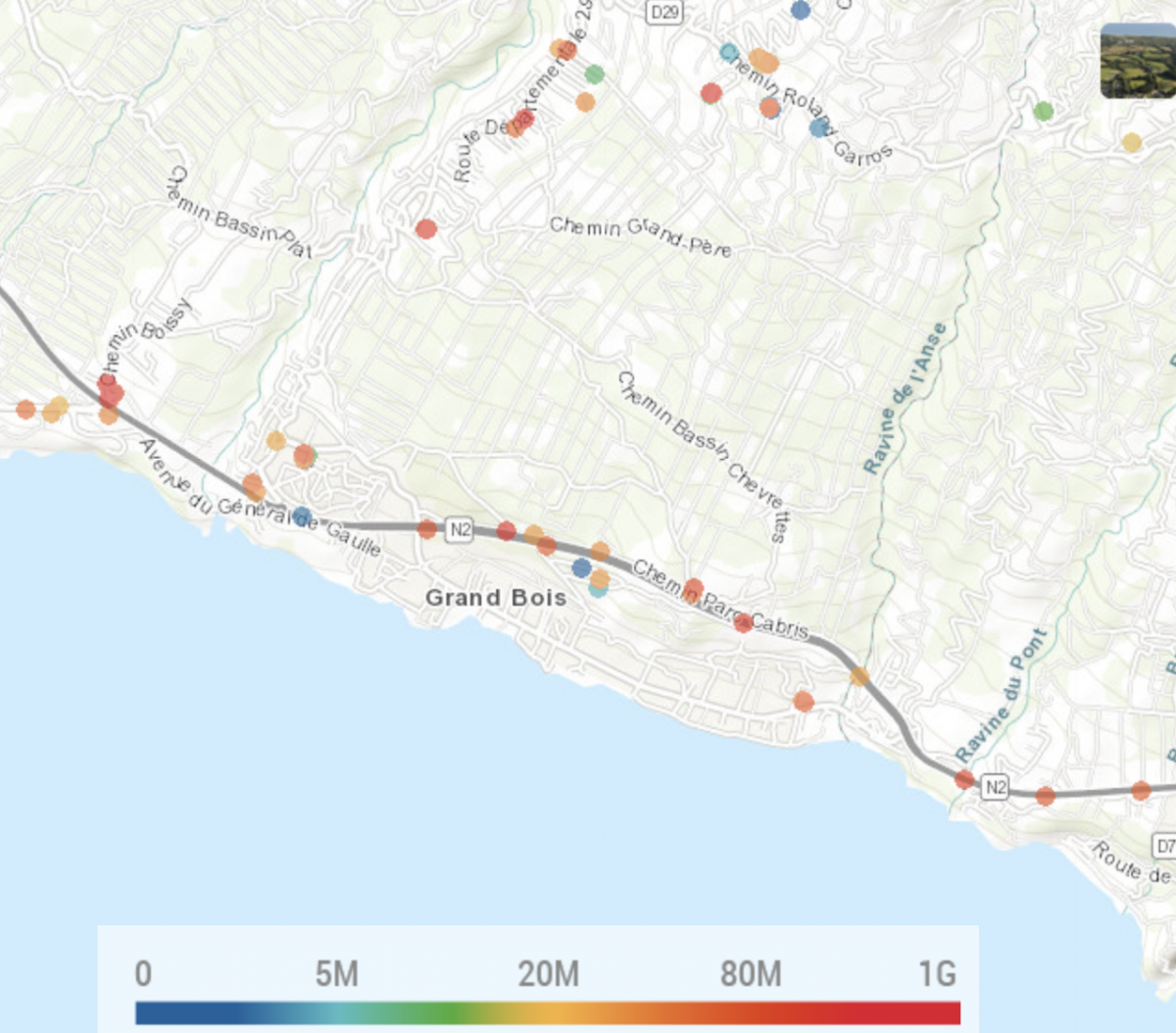Selon les résultats des tests effectués par les utilisateurs nPerf, les zones bleues et vertes ont un débit faible (débit descendant de 0 Mb/s à 10 Mb/s), pour les zones jaunes et oranges le débit est moyen (débit descendant de 10,1 Mb/s à 29,9 Mb/s) et pour les zones rouges le débit est élevé (débit au-dessus de 30 Mb/s).