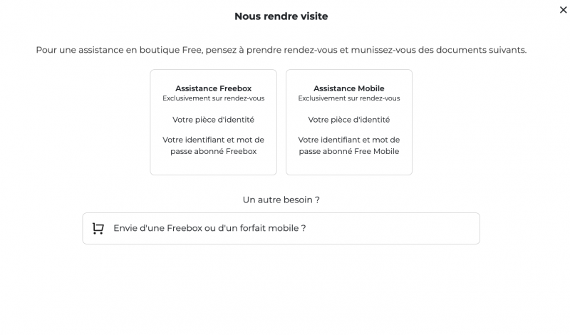 Dans le cas d’une assistance, sur fixe ou mobile, il faudra prévoir une pièce d’identité, ainsi que les identifiant et mot de passe. Mais surtout, Free indique que c’est “exclusivement sur rendez-vous”.