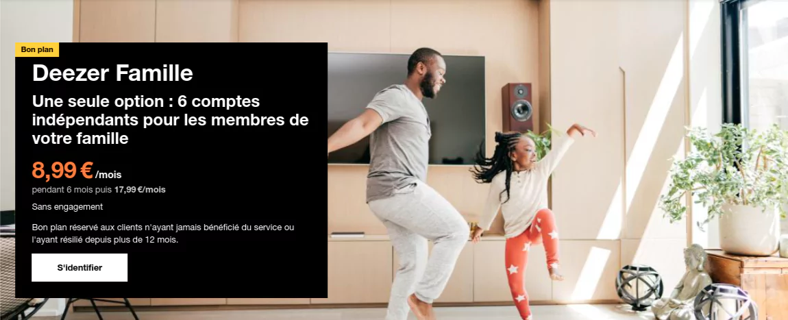 Dès maintenant profitez du bon plan proposé sur l’option Deezer Famille et ce, jusqu’au 16 novembre prochain. Cette option permet aux abonnés de l’opérateur historique et de sa marque à bas prix de proposer 6 comptes premium indépendants pour les membres de votre famille. Cette option est à moitié prix pendant 6 mois soit 8,99 euros par mois puis au delà de la période de promotion il faudra débourser 17,99 euros par mois. A noter que cette option est sans engagement.