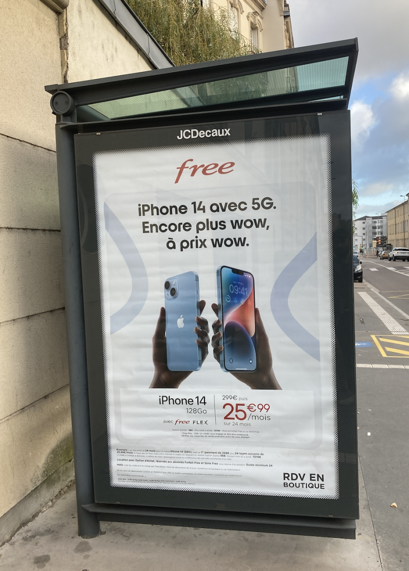 Une nouvelle campagne de publicité Free Mobile avec affichage sur des panneaux publicitaires et sur les abribus. Celle-ci promeut actuellement l’iPhone 14, le dernier né des smartphones d’Apple : ” iPhone 14 avec 5G, encore plus wow, à prix wow”, peut-on lire sur l’affiche. C’est l’occasion pour l’opérateur de mettre en avant sa solution de financement Free Flex avec étalement du paiement sur 24 mois. Ce modèle 128 Go est ainsi accessible à 299€ à la commande puis 24 fois 25,99€. L’option d’achat s’élèvera ensuite à 96€.
