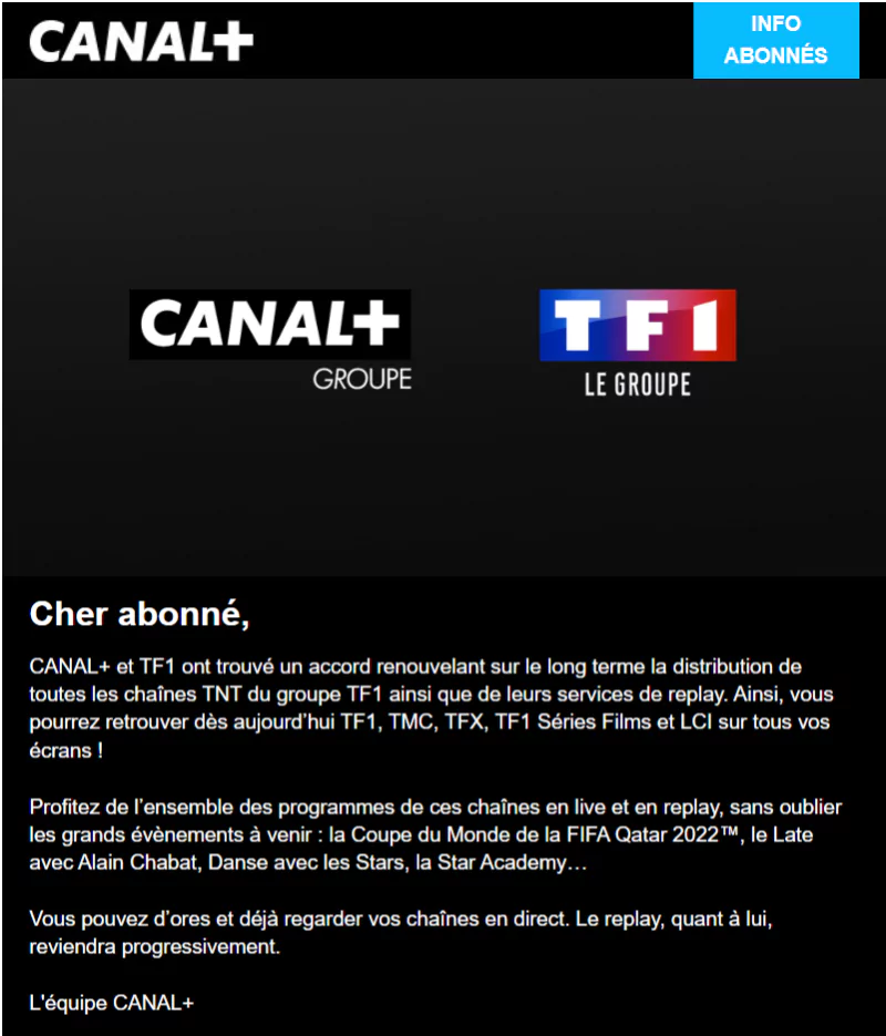 Les abonnés Canal+ retrouve les chaînes du Groupe TF1 dès aujourd’hui annonce la filiale de Vivendi à ses abonnés.