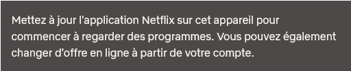 Enfin quid des équipements TV ? Pour les Smart TV, Netflix ne détaille pas précisément les compatibilités selon les marques. La plateforme invite cependant les abonnés voyant le message ci-dessous s’afficher à redémarrer leur appareil, le mettre à jour et si vous n’y avez toujours pas accès, n’hésitez pas à contacter le service clientèle Netflix. Une procédure commune avec d’autres appareils où vous pourriez voir ce message s’afficher.