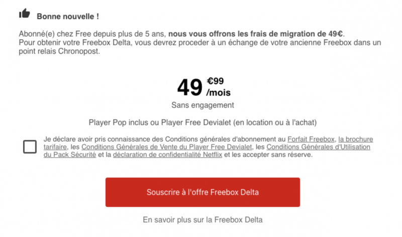 Pour remercier de leur fidélité ses abonnés de plus de 5 ans, Free leur offre les frais de migrations. Ils basculeront ainsi directement sur l’offre Freebox Delta, peu importe le player choisi. Dans les deux cas, les abonnés bénéficient également d’un répéteur wifi inclus. Pour les abonnés moins anciens, il faudra débourser 49€ de frais de migration.