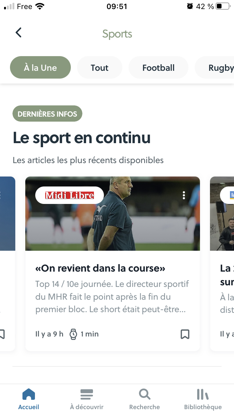 Cet espace dédié accueille toute l’actualité des sports en donnant accès à l’information sur le football (Ligue 1, Ligue 2, Championnats d’Europe, Ligue des Champions), rugby (Top 14, Equipes de France), NBA, Tennis, Cyclisme, etc. Près de 80 médias sportifs sont ainsi accessibles dont belN Sports, SO FOOT, Figaro Sport, AFP Sport, Midi Olympique, Onze Mondial, Pédale!, Basket USA ou encore Tennis Magazine. Pour y accéder, il suffit de se rendre sur la page d’accueil de l’application et site internet ou de se rendre dans l’espace de recherche et sélectionnez la catégorie Sport.