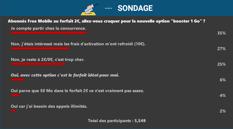 Cependant, il s’agit ici d’une minorité des sondés. 88% d’entre eux ont refusé de craquer pour cette option “Booster 1Go” proposée par l’opérateur. 35% d’entre eux ont affirmés sans embargo leur volonté de partir chez la concurrence suite à l’annonce de Free Mobile. Le prix de l’option qui lui est resté inchangé à savoir 2.99€/mois a refroidi 25% des abonnés interrogés, le considérant trop cher.